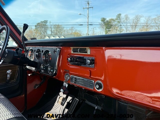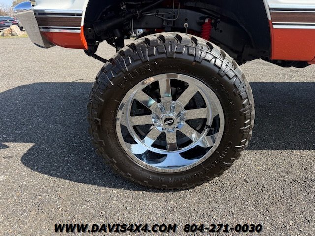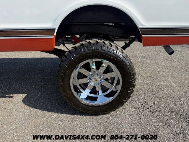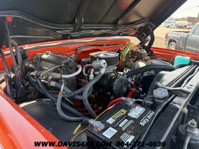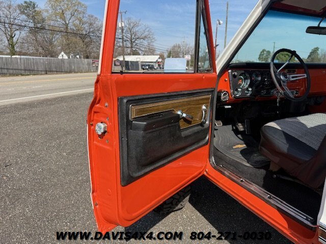 This classic Chevrolet Super Cheyenne K10 4x4 is a standout example of a highly desirable and well-optioned squarebody truck, and it quickly became one of our most talked-about vehicles when teaser photos were released. Finished in the iconic Hugger Orange with a white two-tone—featuring a subtle pearl/metallic flake visible up close—this truck has both the look and the features to match. It’s equipped with a factory tachometer, factory air conditioning (compressor removed but bracket, lines, condenser, and evaporator remain for easy reinstallation), and the classic houndstooth seat material. Other highlights include a brand-new retro-style Bluetooth stereo system (with the original radio and woodgrain trim panels still intact), full-length stainless trim, gleaming chrome, and a 6-inch lift on new 35-inch BFGoodrich All-Terrain tires mounted to factory rally wheels. This long-bed model also features the rare bedside toolbox cut-out, power steering, power brakes (with a new master cylinder, booster, and proportioning valve), new alternator, new carburetor, dual Flowmaster exhaust, replacement gas tank, freshly serviced transmission, and countless details—right down to the functioning dome light. This truck is fully inspected, freshly serviced, and truly turnkey. With a huge range of available tire, wheel, lift, and accessory upgrades, the possibilities are endless for customizing this or any of our Squarebody generation trucks. For a closer look, check out the detailed video on the Davis Auto Sales VA YouTube channel, as well as additional clips on the Davis Drives YouTube channel.