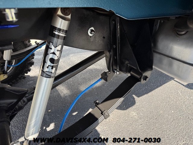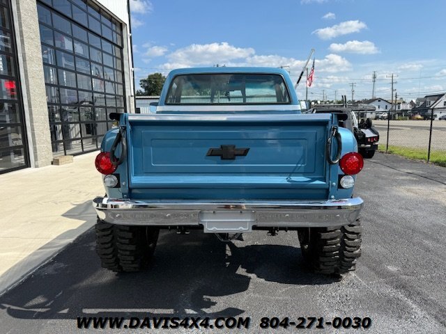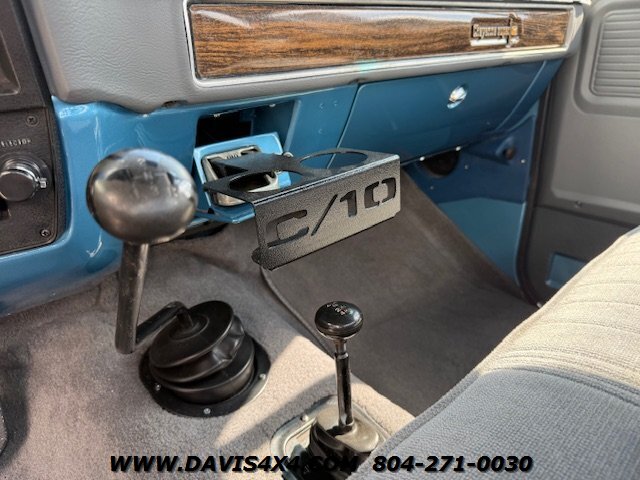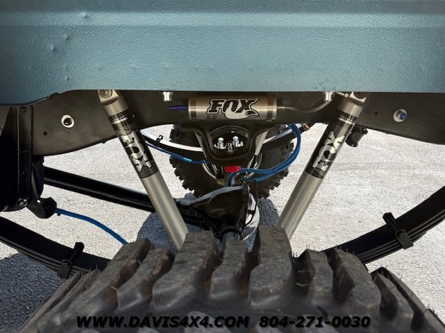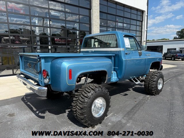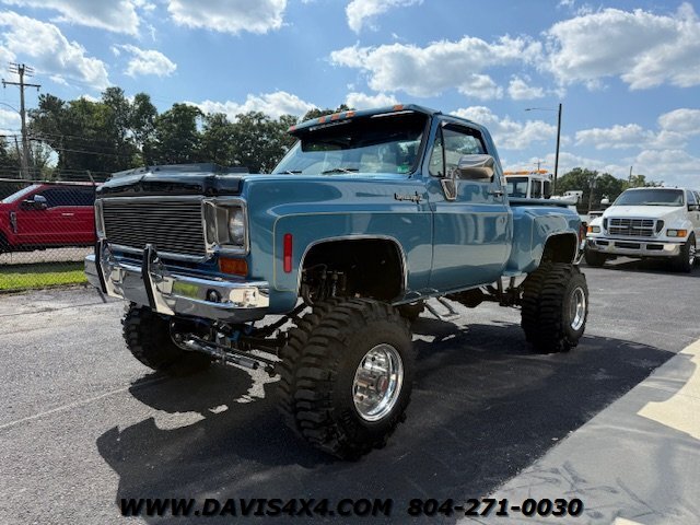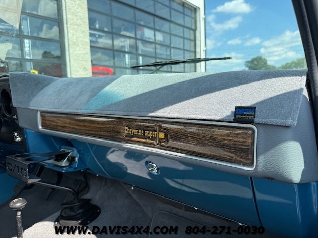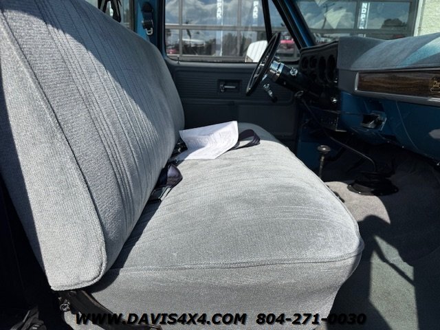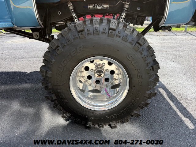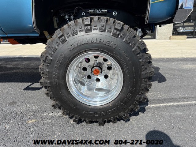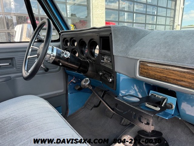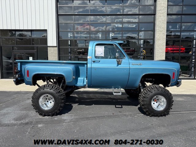 Chevrolet Cheyenne Super K10 4x4 Squarebody Stepside. This classic pickup recently received a full Davis Off-Road treatment, featuring an 8-inch all-spring suspension lift, brand new 35-inch Super Swamper Boggers mounted on rare 15x16 “Holy Grail” DOR wheels, dual Fox shocks with reservoirs front and rear, chrome differential covers, and dual Fox steering stabilizers with crossover steering. The bed sports a finished wood-grain floor, while the interior includes a custom cloth-covered seat, new carpet, a four-speed transmission, a mild/stock small-block engine, a retro double-knob radio, a billet grille, and even a cupholder cleverly built into the ashtray. This truck runs strong, has an impressive, stocky stance, and is a rare sight as a stepside Squarebody today.