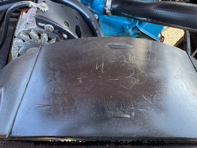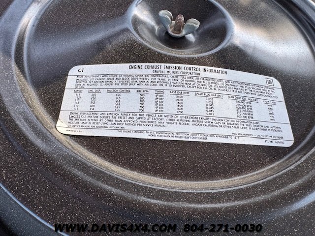 1977 Chevrolet Scottsdale K20 Squarebody 4x4. According to all paperwork and documentation, this is a 19,000-original-mile, highly original truck. Even the last oil change sticker in the door jamb helps validate the mileage. One of the most impressive aspects of this truck is the presence of factory chalk marks, which remain clearly visible—even the mark on the fan shroud from when antifreeze was checked at the factory. There are several other chalk marks and original decals still in place, along with an untouched undercarriage. We have not applied any undercoating or paint underneath.
