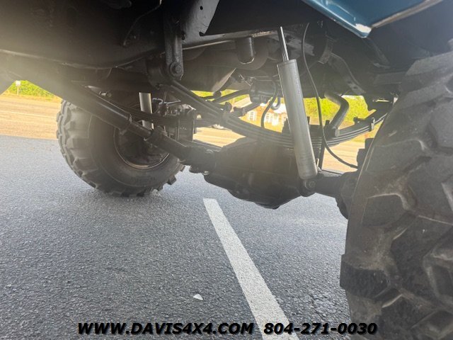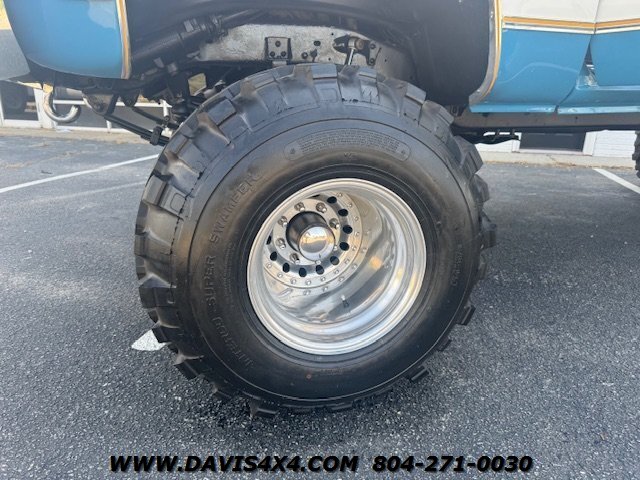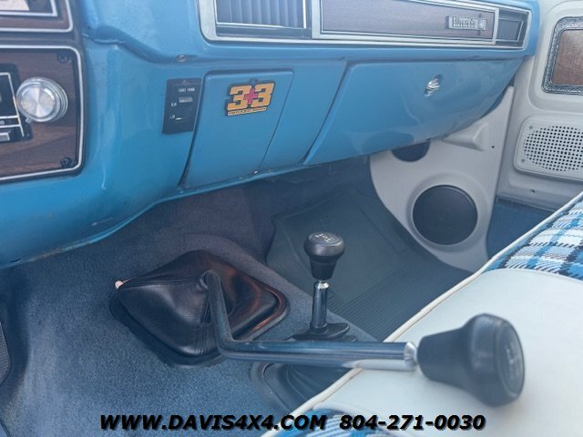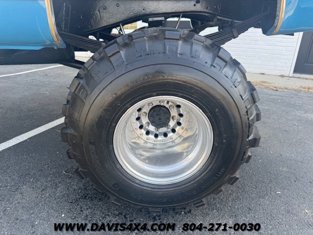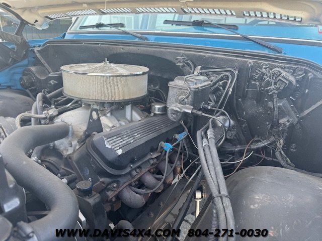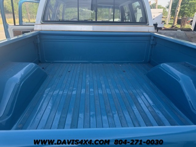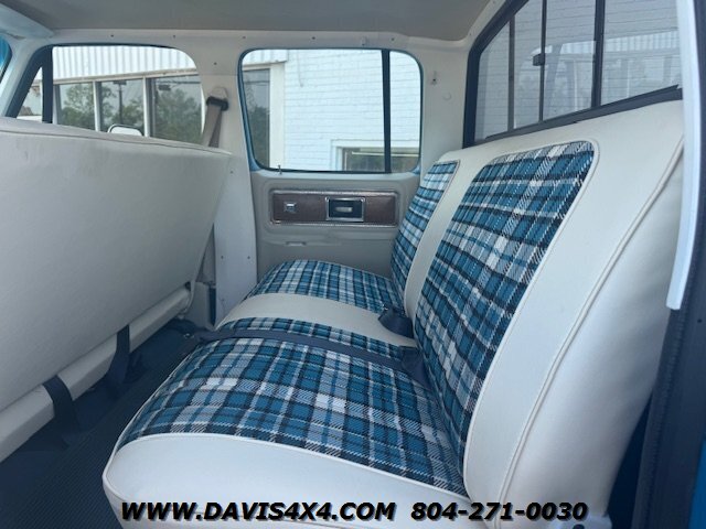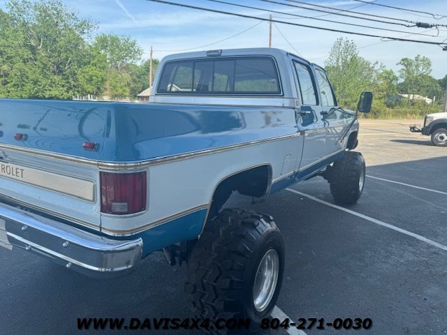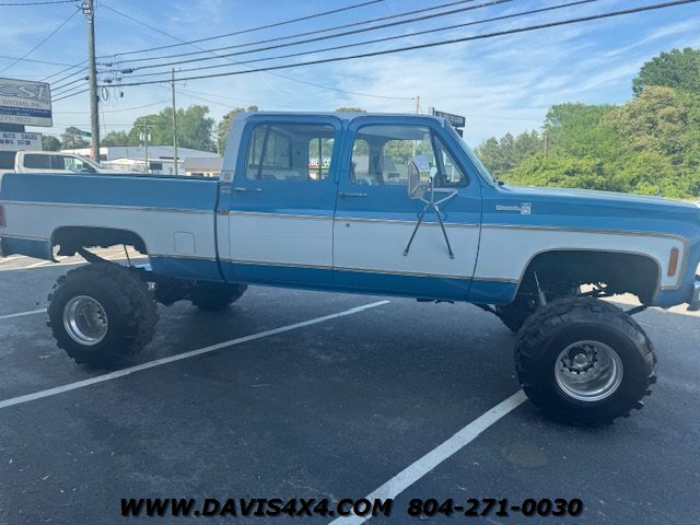 1978 Chevrolet K30 Squarebody Crew Cab 3+3 Short Bed 4x4, lifted. Please watch the detailed video of this truck, which explains its background and features in full. Finished in a two-tone blue over white with racetrack trim and a cowl hood, this big block, one-ton crew cab has been converted to a short-bed configuration—something GM never produced—making it a truly unique build.