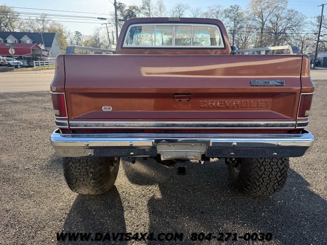 Chevrolet Scottsdale K10/K30 short-bed lifted Squarebody. This truck is sitting on 12 inches of suspension lift with an original first-generation set of 39x18.50x16.5 Mickey Thompson Baja tires in near-new condition, mounted on a set of 14-wide Alcoa-style alloy wheels (we also have a Bogger wheel and tire package available). It is equipped with one-ton axles, including a Dana 60 front and a Corporate 14-bolt rear with a disc brake conversion. This truck features crossover steering, a track bar system, Superlift suspension, dual steering stabilizers, and one of the coolest front-end setups with marker lights integrated into the bumper. Overall, the truck is very solid underneath and in body condition, finished in a burnt orange/bronze color, with most—if not all—of the paint appearing to be original. We have outfitted it with a retro-style radio system with Bluetooth, serviced and inspected the truck, and completed several upgrades. It has a well-built small block that sounds great and runs strong; everyone who has driven it has commented on how well it performs. It also features a custom Flowmaster dual exhaust and a fully coated undercarriage with a very clean appearance. Overall, this truck has a great stance, a lot of excellent upgrades and improvements, and we would be happy to take it even further to suit anyone’s preferences.