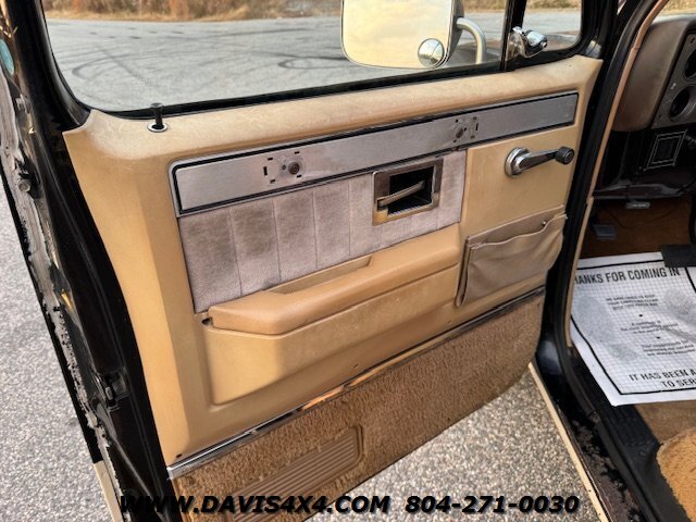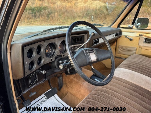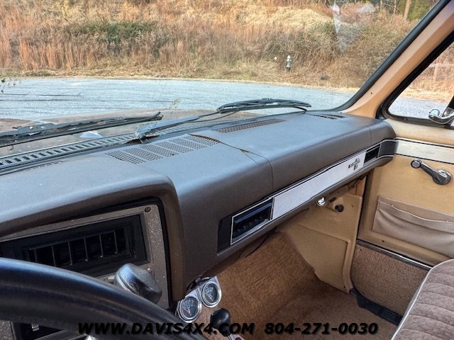 1985 Chevrolet Silverado K10 4×4 Squarebody. This rust-free, exceptionally solid long-bed Silverado is an increasingly hard-to-find specimen, powered by a replacement 5.7L 350 V8 with Edelbrock carburetor and fitted with an aftermarket A/C system. The undercarriage is remarkably clean and original—even the inner fenderwells are untouched—and at the time of photos and video we did no paint or undercoating to ensure nothing is hidden. Freshly serviced and inspected, it features new exhaust, new shocks, brand-new Michelin white-letter tires on rally wheels, a step rear bumper, Silverado two-tone trim in Brown over Tan, dual tanks both functioning properly, and the original factory stereo with a few tasteful auxiliary gauges. The interior shows well overall, and we have a color-matched replacement dash pad on order to address the cracking in the original. Much of the paint is believed to be original, showing typical fade but zero rust or rot, making this an ideal driver as-is—or a perfect candidate should it move into our restoration lineup for further upgrades or even a fresh paint job. Ready to enjoy immediately.