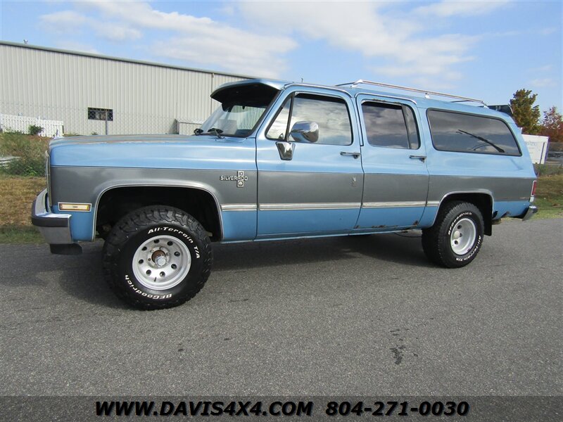 1987 Chevrolet Suburban Four-Door 4X4 Square Body SUV Silverado C/K 10 Trim Package. The Suburban is by no means perfect, it has rust in the typical areas but not as bad as some, has the 5.7 350 V8 fuel injected engine, in the engine has definitely been replaced with all obvious signs pointing to it not being terribly old, air condition system still intact, roof rack, faded paint, does need a headliner, has oversize BF good rich tires on aftermarket Mickey Thompson style wheels, overall decent truck runs out well, perfect hunting vehicle, take to the lake, river, pull the trailer, leave at the beach, etc. Not going to win any car shows with this unit but you will have a good old-school classic square body dependable vehicle.