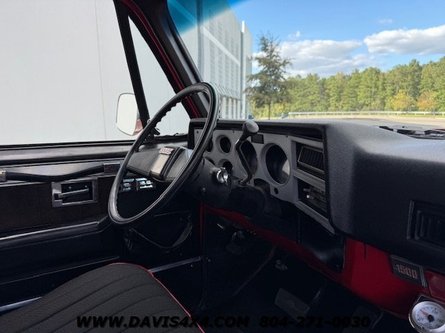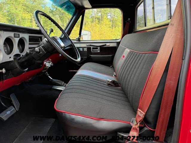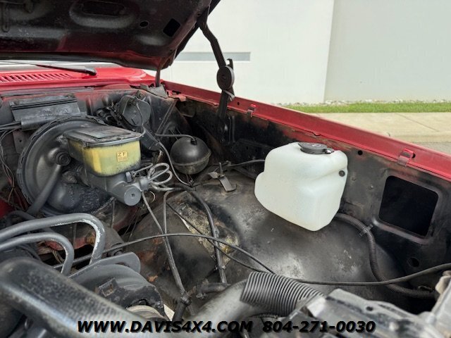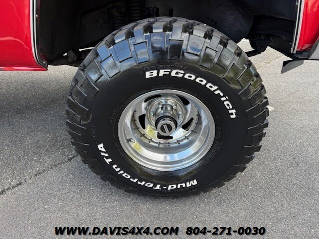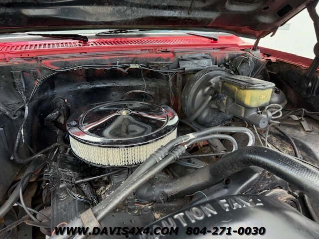 The 1987 GMC Sierra Classic V10/K10 1500 Squarebody pickup features custom upholstery with a like-new seat, 35-inch BFGoodrich Mud-Terrain tires on chrome wheels, a steel cowl induction hood, and a bright red finish with spray-in bedliner. Additional highlights include a sliding rear glass window, 4-inch lift kit with new bushings, dual shock system, dual steering stabilizer, chrome differential cover, dual exhaust, replacement dash pad, and a rear roll pan with receiver hitch. This truck runs, drives, and operates well but is best described as an average-condition vehicle that has undergone many recent repairs and maintenance. It is not one of our high-end custom Squarebody builds or $100,000-plus restorations, but as seen on our YouTube channel Davis Drives, it has been reconditioned extensively since we purchased it. We would still classify it as a good-looking “10-footer,” making it a great choice for a hunting truck, weekend toy, or fun project vehicle. Please watch all videos of this trucks journey on davis drives. This is an AS-IS Sale.