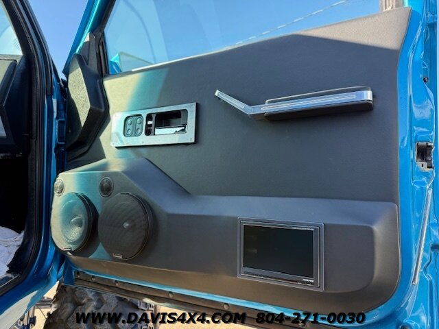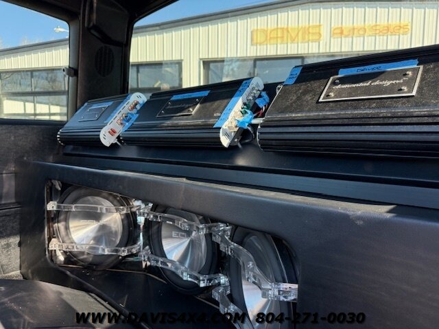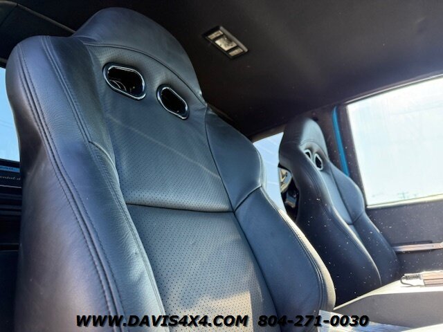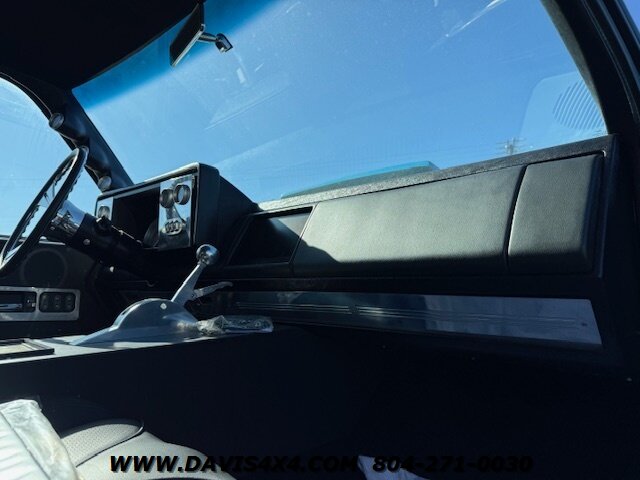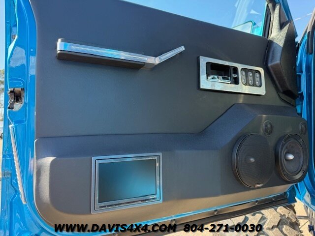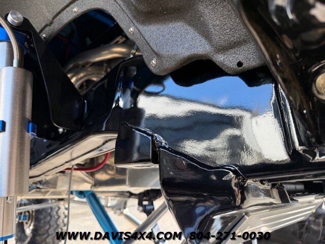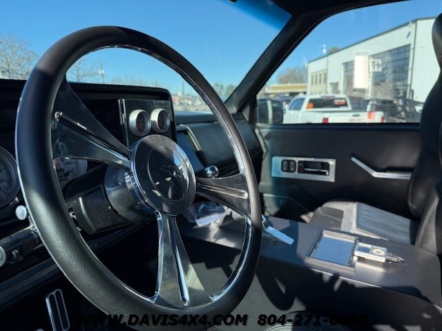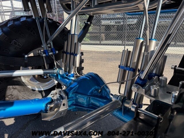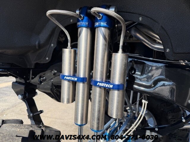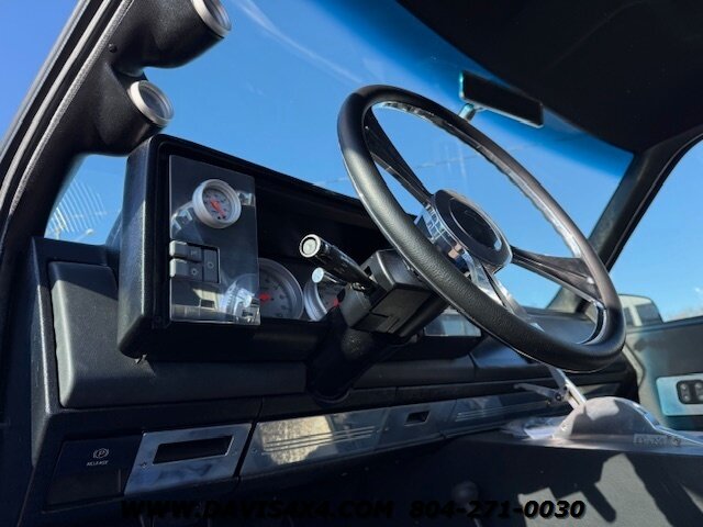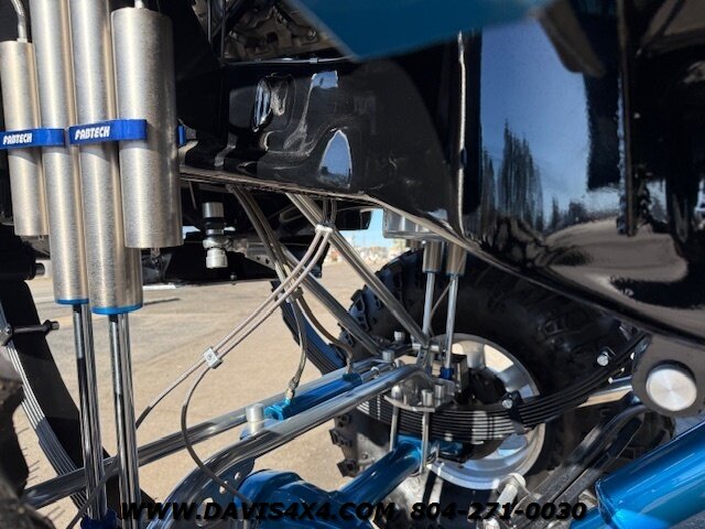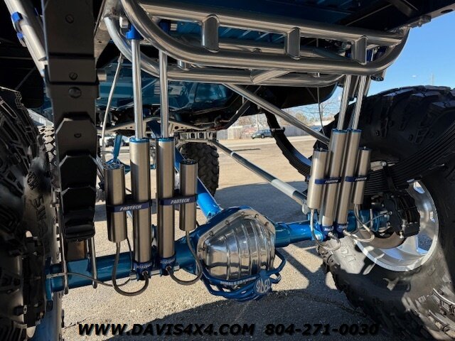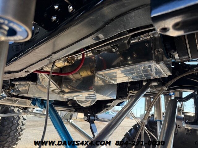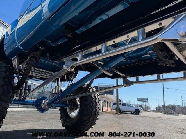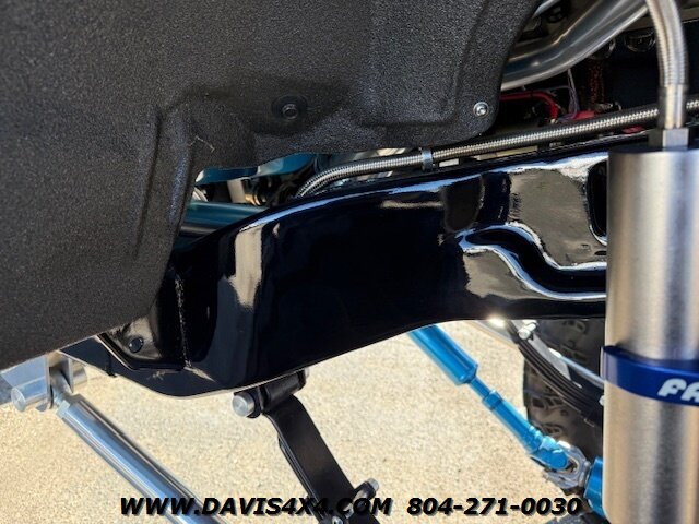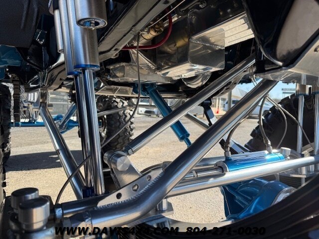 This was a full frame-off build, with every nut, bolt, and fastener replaced and/or upgraded along the way. Under the hood sits a crate small block that sounds incredible through a custom exhaust system. It also features front and rear driveshafts, dual-reservoir Fabtech shocks at each wheel, plus four additional custom-mounted shocks on an axle truss hoop across the rear. A custom-built removable tubular bumper overlay system and steel cowl induction hood finish off the aggressive stance. The list truly goes on and on.
