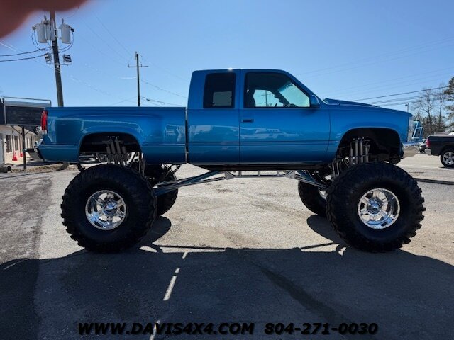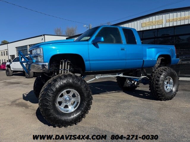 1994 Chevrolet Silverado OBS Step side Monster Show Truck. This 4x4 beast has been an ongoing project that has literally just been completed to 100% perfection. This is not an old-school show truck — this is a freshly finished build, the culmination of nearly 20 years of work by some of the best and most extremely talented hands in the industry. It sits on 49” Super Swamper IROK tires mounted on Weld Racing wheels and features an SAS (Solid Axle Swap) suspension with 1-ton differentials and disc brakes front and rear. The build includes a custom tubular subframe, high-steer system with hydro assist, color-matched paint and powder coat, Jet-Hot coating, and chrome galore.