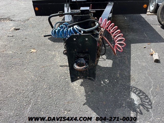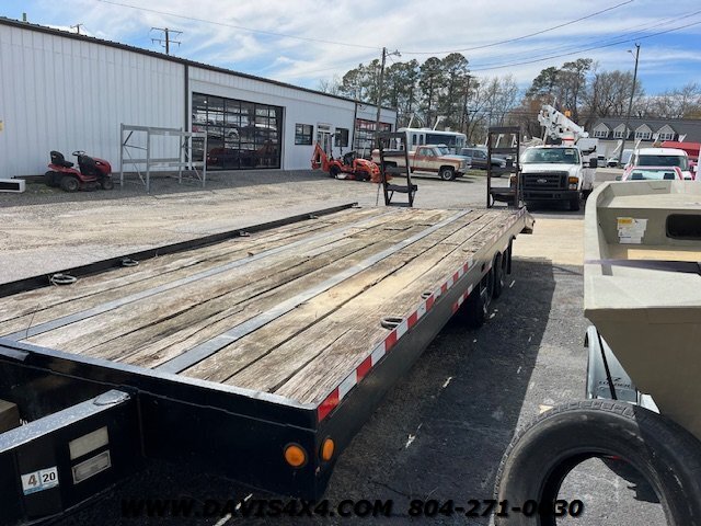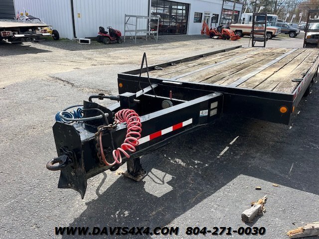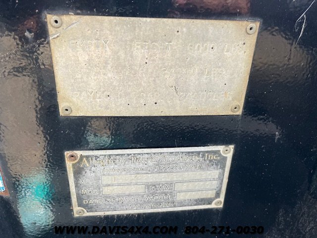 1997 Allegheny Power Product 24-foot dual tandem trailer. Features a 20-foot flat deck, 96 inches wide, with a 4-foot dovetail and drop-down ramps. This dual tandem equipment trailer was repainted not long ago; the boards are in acceptable condition and it has a good overall appearance. The tag shows an empty weight of 8,000 lbs and a GVW of 24,000 lbs. The brakes have been chambered; we are unsure if they were removed or could be reused. It was only used around a farm and currently pulls, moves, and operates as it should, just without brakes. Originally an air brake trailer, it does have a pintle hitch, and the jack crank works and has been replaced. Sold as-is—feel free to check it out any way you’d like. We do have a clear title.