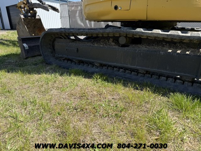 2014 CAT 304CR enclosed cab mini excavator. This unit has 993 hours and is equipped with a 24-inch bucket with teeth and a thumb. The tracks have good tread, with some minor dry cracking noted. The enclosed cab unit appears very solid and operates well, with no major leaks observed. Ready to be put to work.