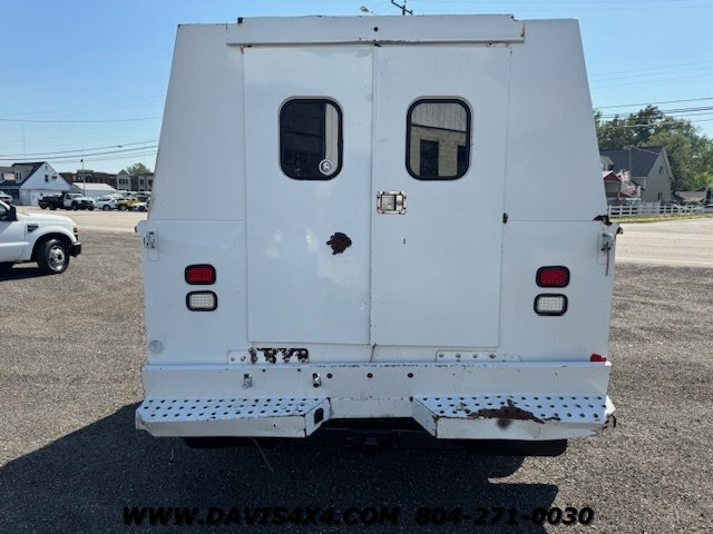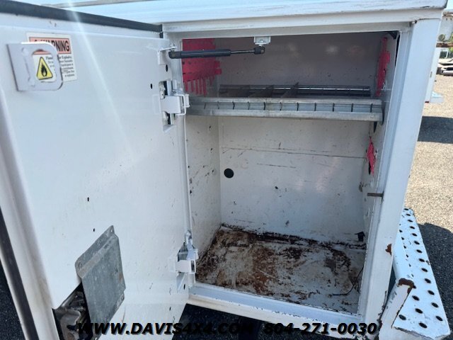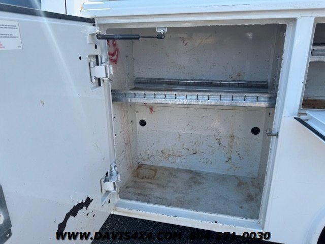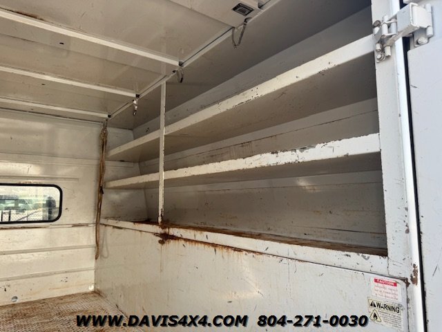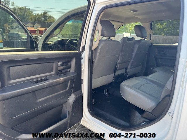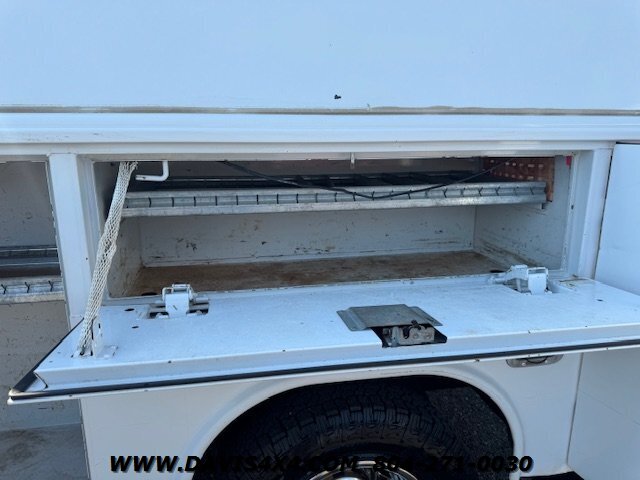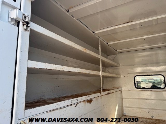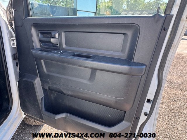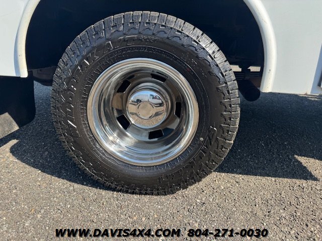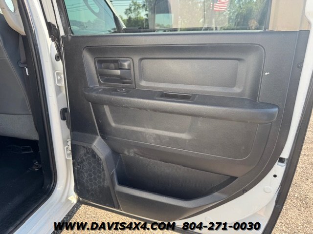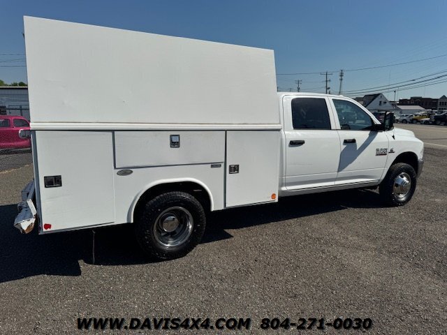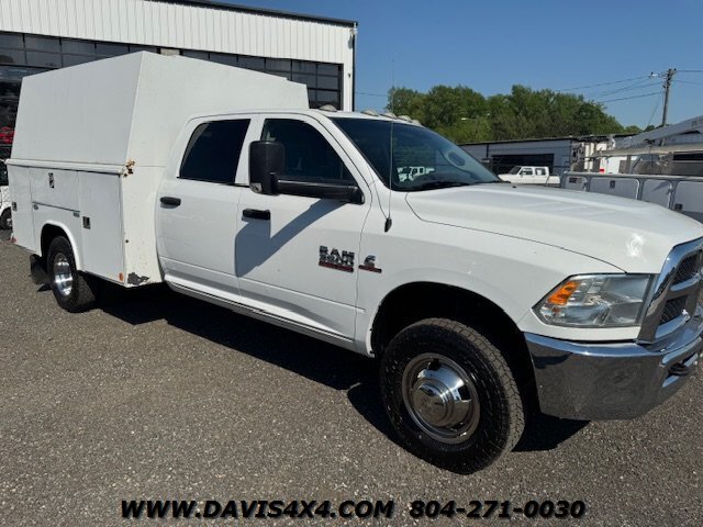 Dodge Ram 3500 Crew Cab 4x4 utility work truck. This unit is equipped with an Reading enclosed utility body, dual rear wheels, and a Cummins turbo diesel under the hood. Fleet company owned since new, it shows the typical wear and tear expected from a commercially used vehicle. The rear bumper is twisted and dented, and the rear trailer hitch shows use; however, it has very decent tires all the way around.