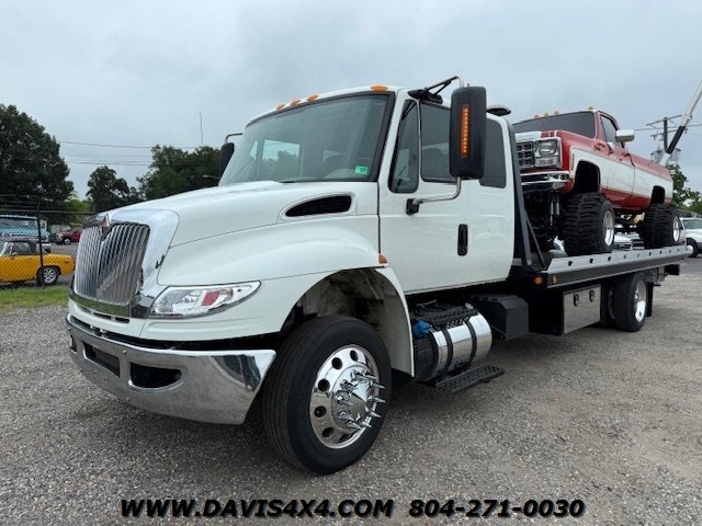 International 4300 Extended Cab Flatbed Tow Truck Rollback. Cummins turbo diesel engine, Miller Industries Century 12,000-pound bed steel with removable blade rails, 21.5 x 102 Air Ride LCG suspension, new front tires, freshly serviced and inspected. Rear wheel lift with tow ball mount, Beacon light bar, LED lights. Air Ride seat. Very well-equipped, locally owned single-owner truck updated with a new unit. This unit is missing the doors for the toolbox has a dent in the front bumper, and the paint is flaking on the left filler panel side from that. This is a very functional truck, and the company did maintain it in house and depended on it daily. We have no problem reconditioning this unit further for a perspective customer at a reasonable cost basis but to keep the price point as we did what you see is what you get priced as is.