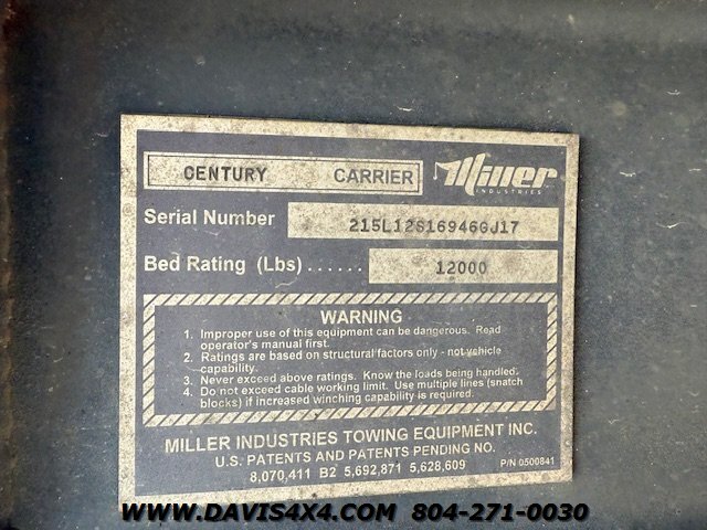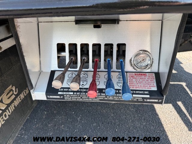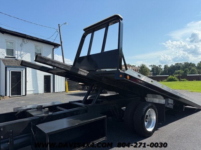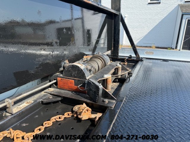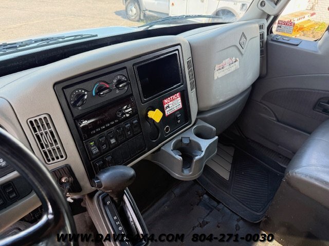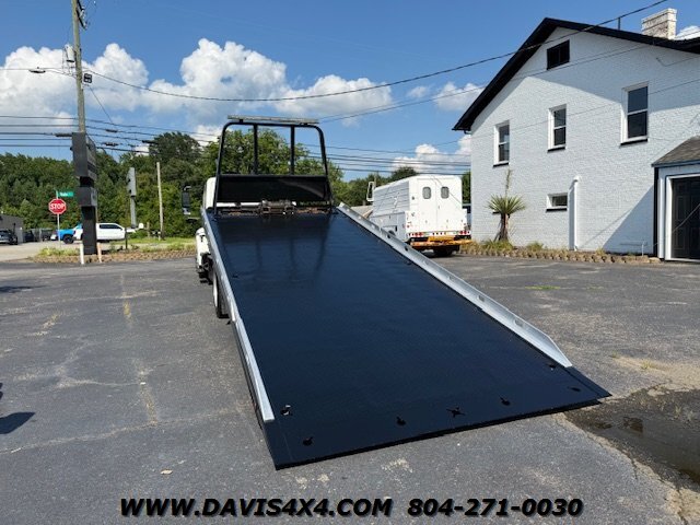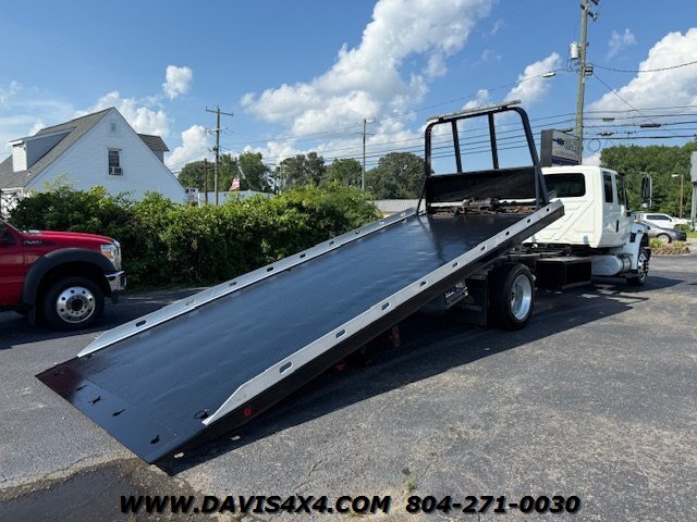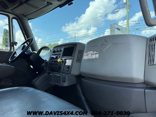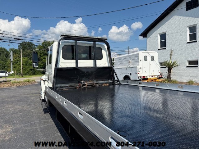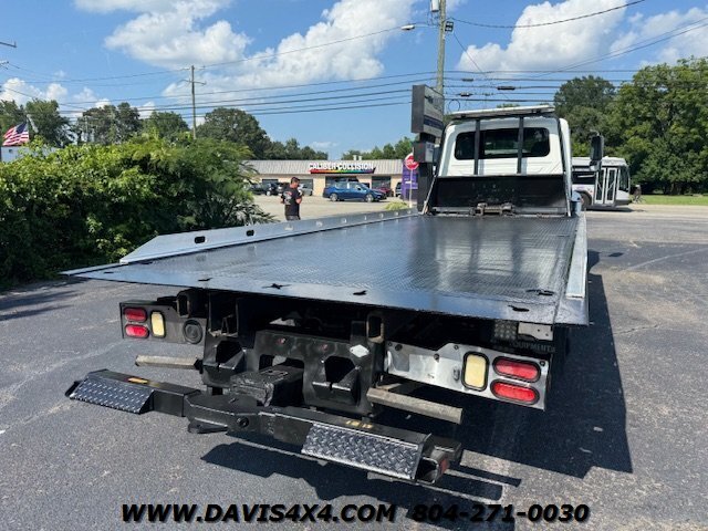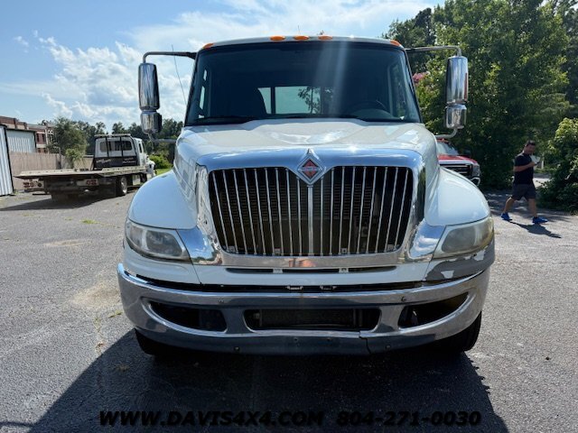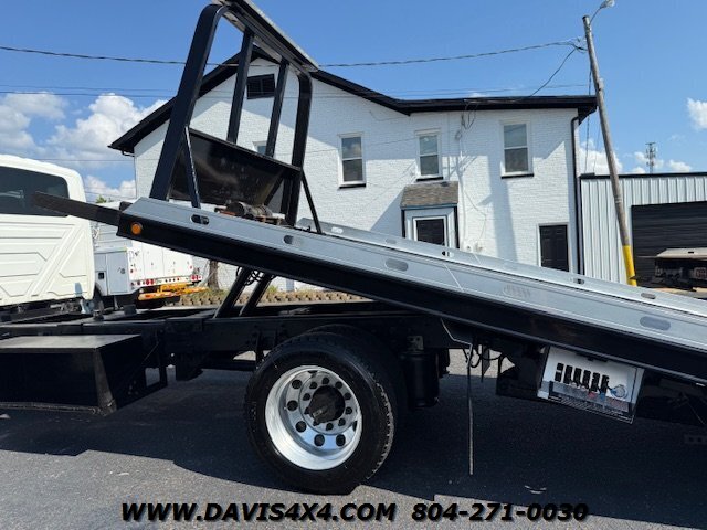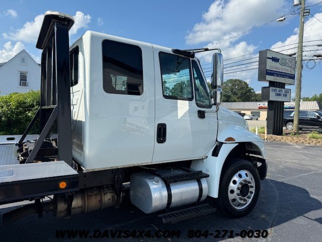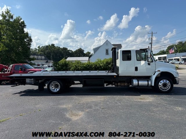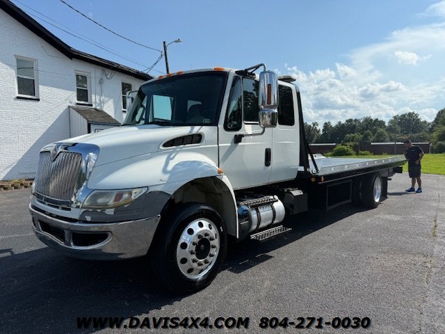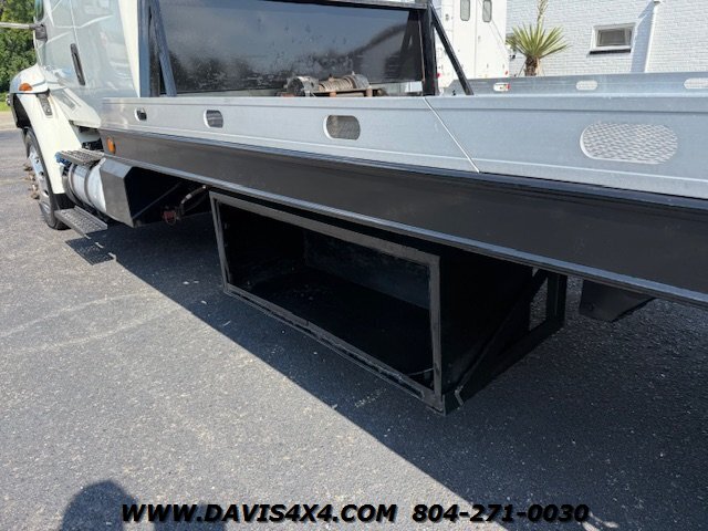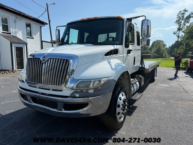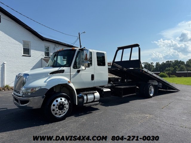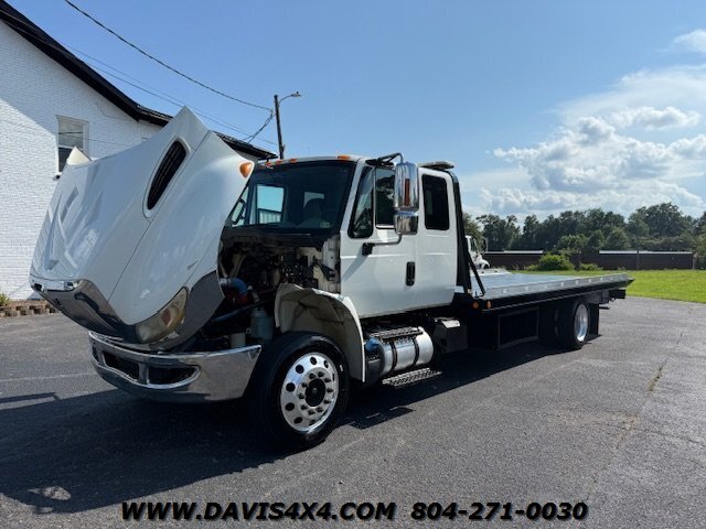 International 4300 Extended Cab Flatbed Tow Truck Rollback. Cummins turbo diesel engine Miller Industries century 12,000 pound bed steel with removable blade rails 21.5 x 102 Air Ride LCG suspension new front tires freshly serviced and inspected rear wheel lift with tow ball mount Beacon light bar LED lights Air Ride seat very well equipped locally owned single owner truck updated with a new unit. This unit is missing the doors for the toolbox has a dent in the front bumper, and the paint is flaking on the left filler panel side from that. This is a very functional truck, and the company did maintain it in house and depended on it daily. We have no problem reconditioning this unit further for a perspective customer at a reasonable cost basis but to keep the price point as we did what you see is what you get priced as is.