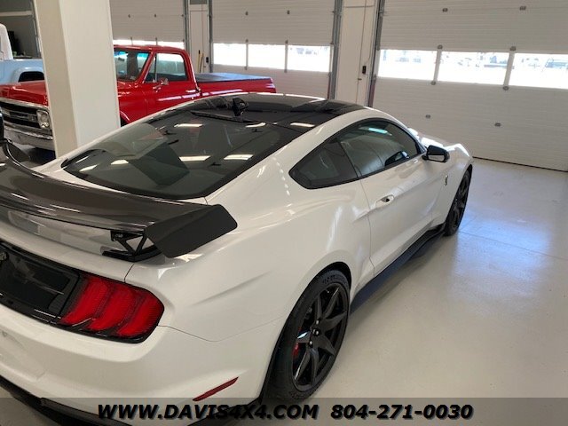 Sold to a customer from Delaware Ontario Canada. 2020 Ford Mustang Coupe GT500 Shelby Supercharged Cobra Carbon Fiber Track Pack Sports Car. This is chassis number L1910 Equipped with technology package carbon fiber, track pack painted glass roof, white color with stripe delete, carbon fiber wing, 20 inch Michhelin tires on carbon fiber wheels, brembo brakes and chin spoiler. Other factory options are two piece vented brake rotors, hood vent, LED signature lamps, LED tail lights, quad tip exhaust, 12 inch LCD screen, Alcantara wrapped steering wheel, GT500 exclusive trim package, floor mats, paddle shifters, Recaro leather trimmed seats, B & O Soundsystem, voice activated touchscreen navigation and all the other basic features are photographed in the window sticker which is included with this car as well as all the other factory features. This car has only been driven twice stored in a climate controlled show room ready for immediate delivery title in hand clear.