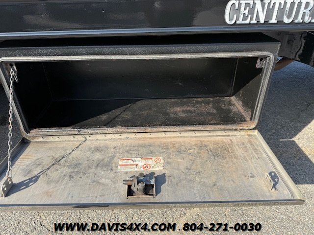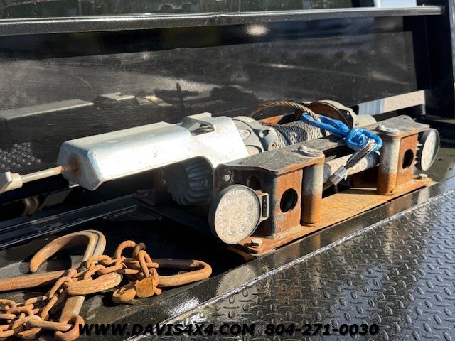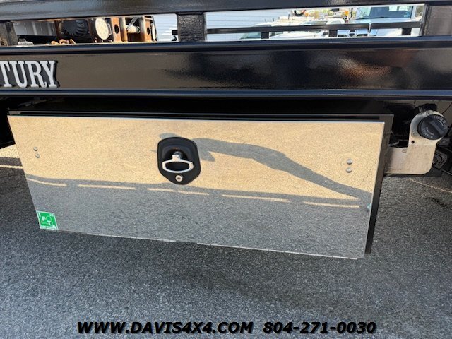 Ford F-550 Super Duty tow truck with rollback flatbed Century bed. You would truly have to look twice to realize this is not a brand-new unit—just thoroughly detailed top to bottom, inside and out, and fully serviced. This truck is equipped with a 19.5 x 96 steel Century flatbed with removable rails, a hydraulic winch with new cable, a Whelen strobe light bar, dark tinted windows, and a chrome appearance package. It also features side steps, left and right side toolboxes, and recently replaced tires. The wheel lift includes a towing ball mount, and the truck comes equipped with all the towing apparatus needed to get to work immediately, including fresh safety gear, straps, and chains. This is a sharp, ready-to-go unit.