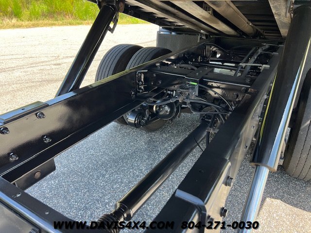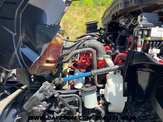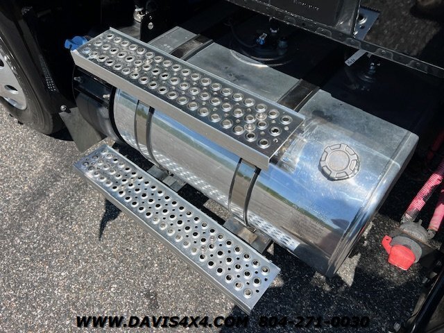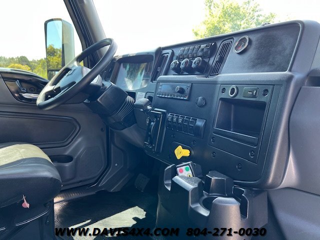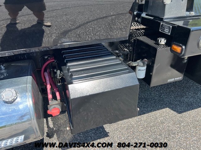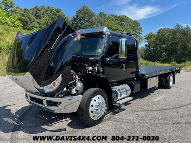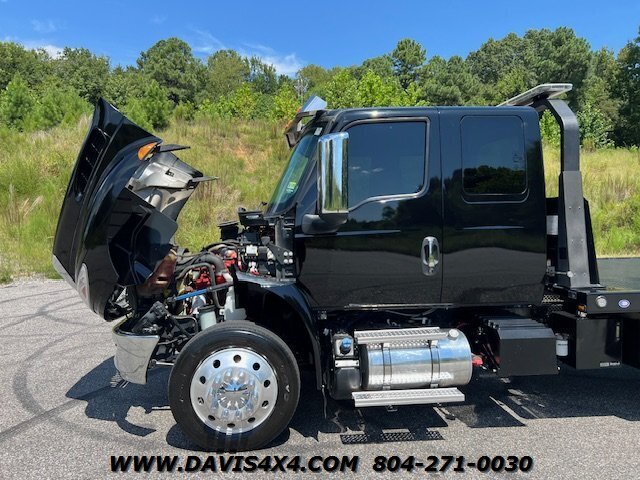 2023 International MV Extended Cab Rollback Tow Truck. Please call before viewing, these are SAMPLE PHOTOS. This unit has the Cummins turbo diesel engine, five passenger seat, seating dark tinted windows, drivers and passenger Air Ride seat Bluetooth stereo updated interior Jerrdan steel 22 x 102 bed, left and right side, toolboxes trashcan mount rear wheel lift with towing ball mount LED lights work lights strobe light bar left and right side polished alloy fuel tanks 22.5 alloy wheels. This is one good looking clean, jet, black truck, freshly serviced and properly inspected the photos you see our sample photos we will upload the proper pictures once this one is finished in Detail shop.